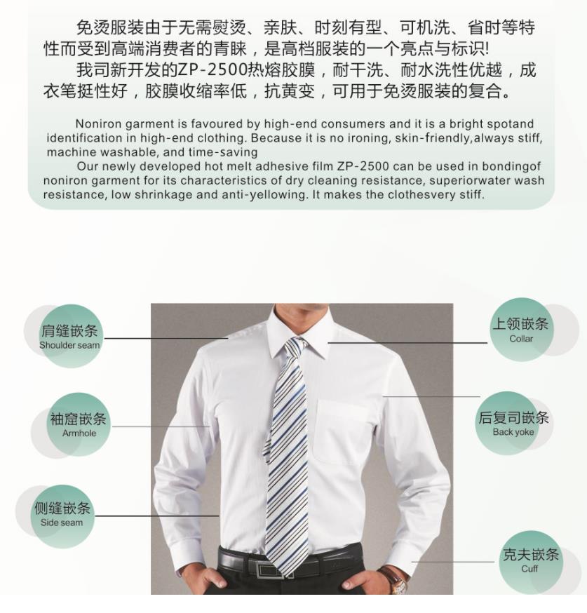 Việc sử dụng lớp lót màng dính nóng chảy trên cổ áo và cổ tay áo đã dần trở thành lựa chọn tốt hơn cho những chiếc áo sơ mi không cần ủi cao cấp.